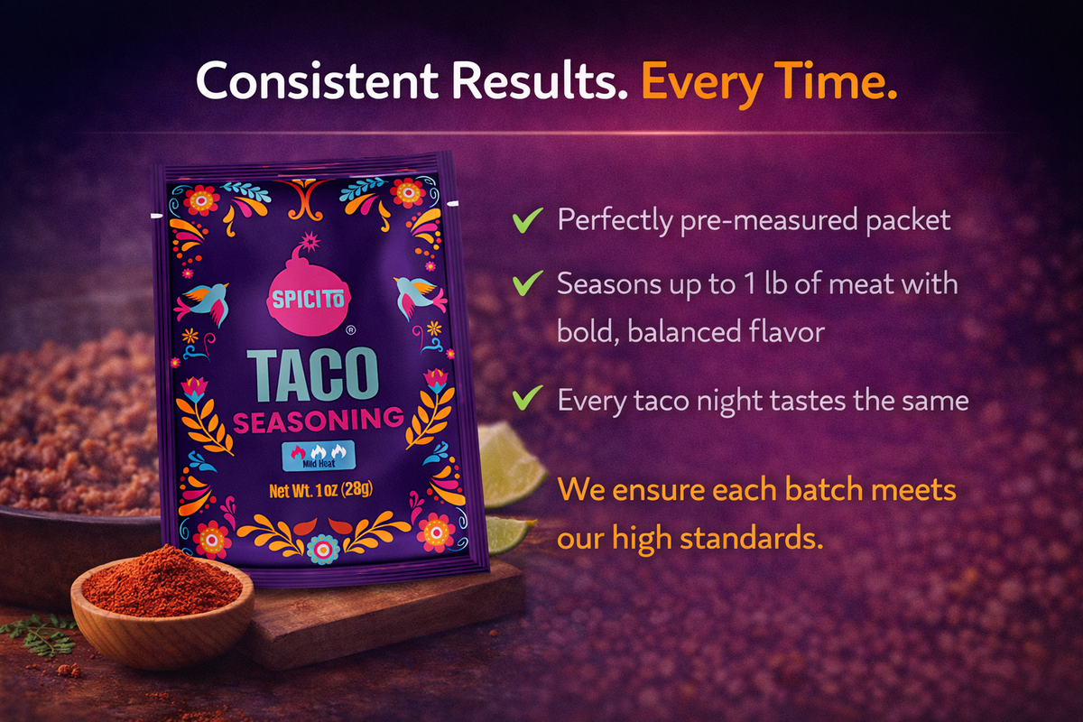Spicito Taco Seasoning is a bold, easy-to-use seasoning blend designed to help you make flavorful tacos at home. It is made for simple prep and great for quick weeknight meals.